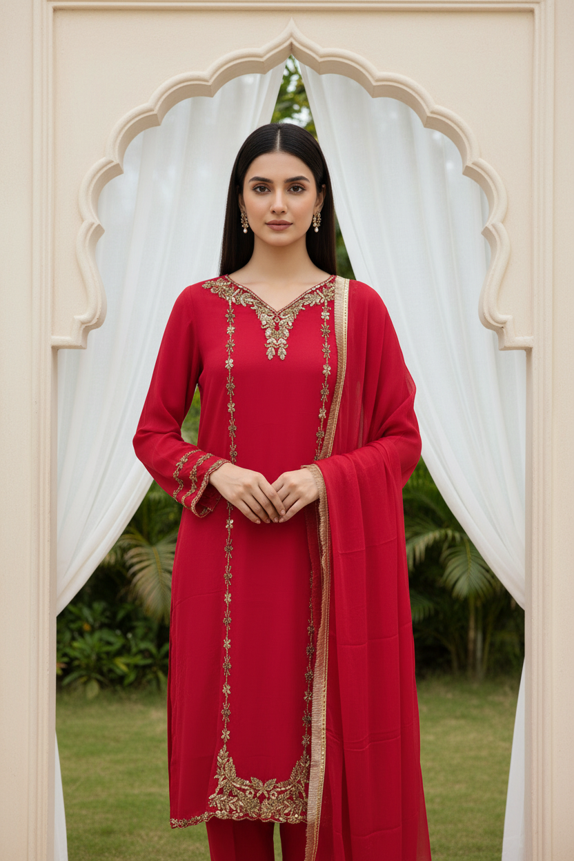 322D -RED CHIFFON EMBROIDERED ADDA WORK SUIT