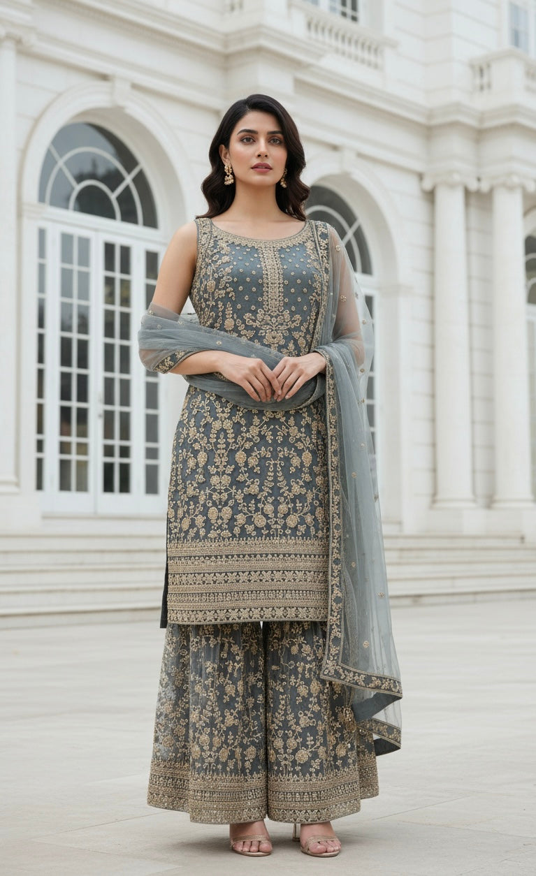 7001B- GREY EMBROIDERED & EMBELLISHED SHARARA SUIT