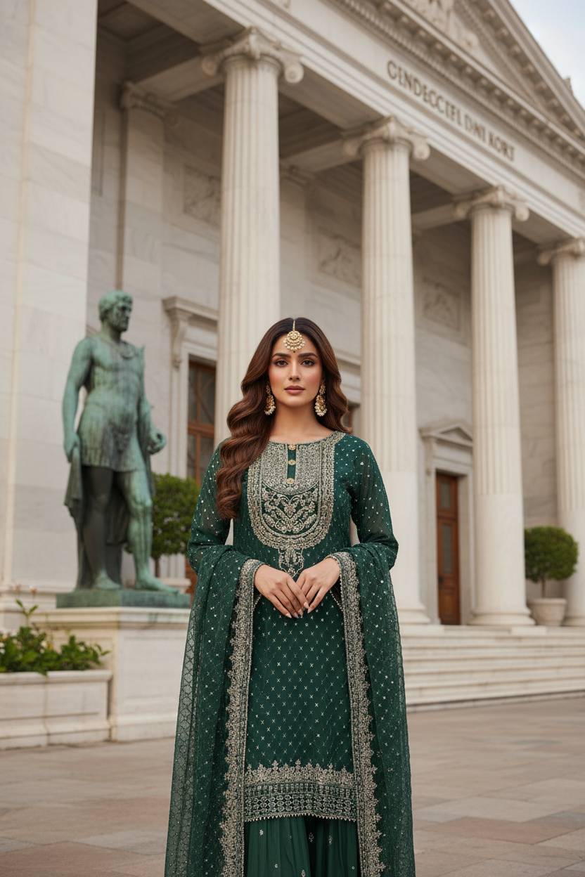 381A- GREEN CHIFFON EMBROIDERED SHARARA SUIT