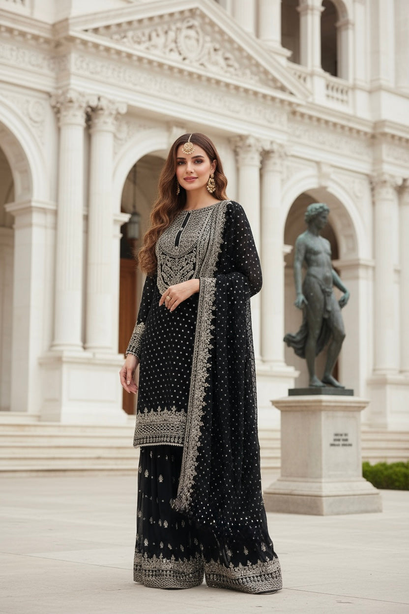 381J - BLACK CHIFFON EMBROIDERED SHARARA SUIT