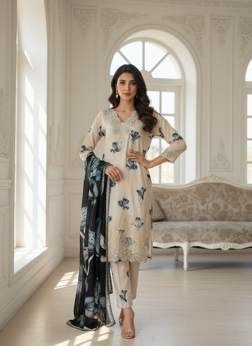 KB01 - EMBROIDERED LINEN PRINT 3 PIECE SUIT