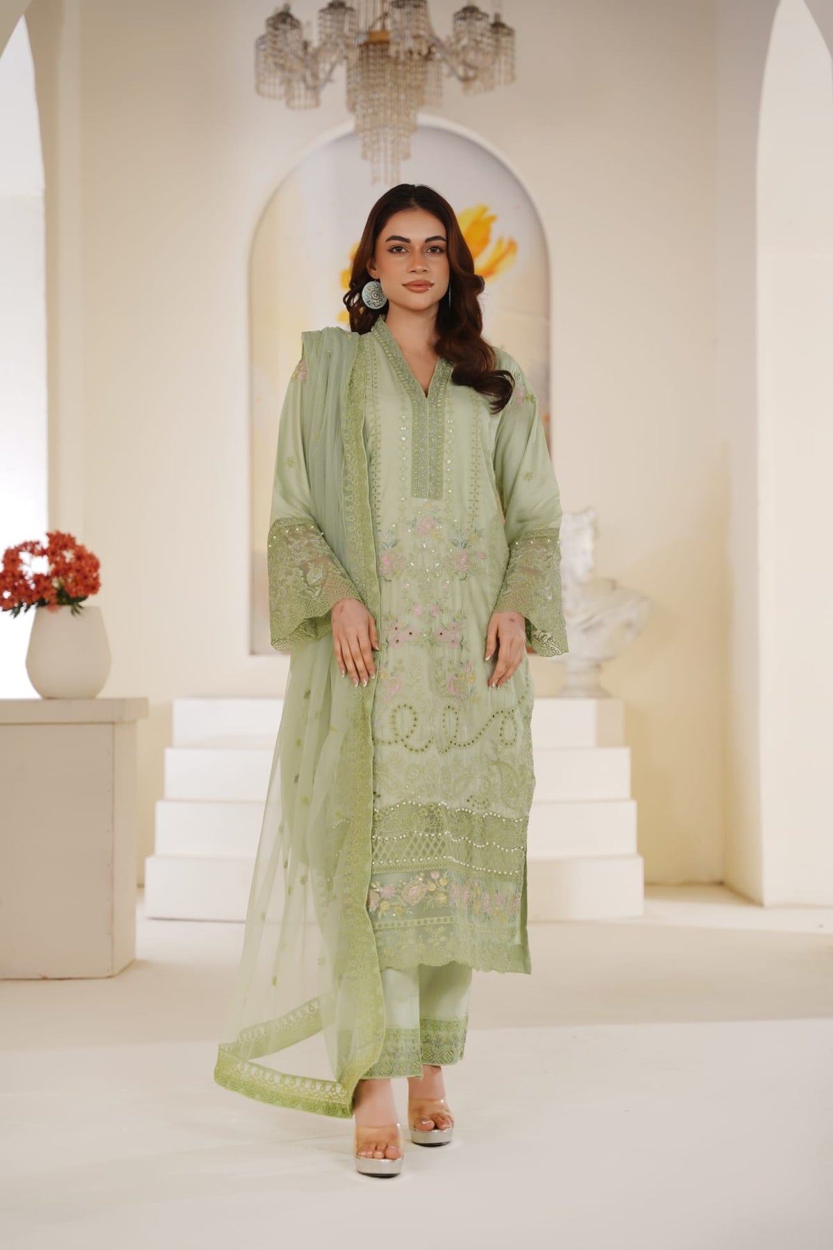 1165A - Light Green Embroidered Linen Chikankari 3 Piece suit