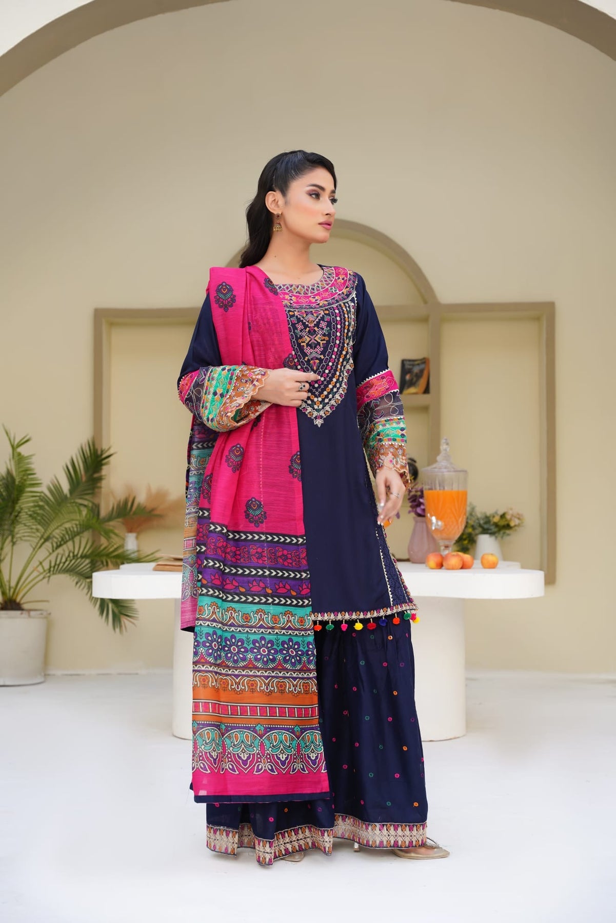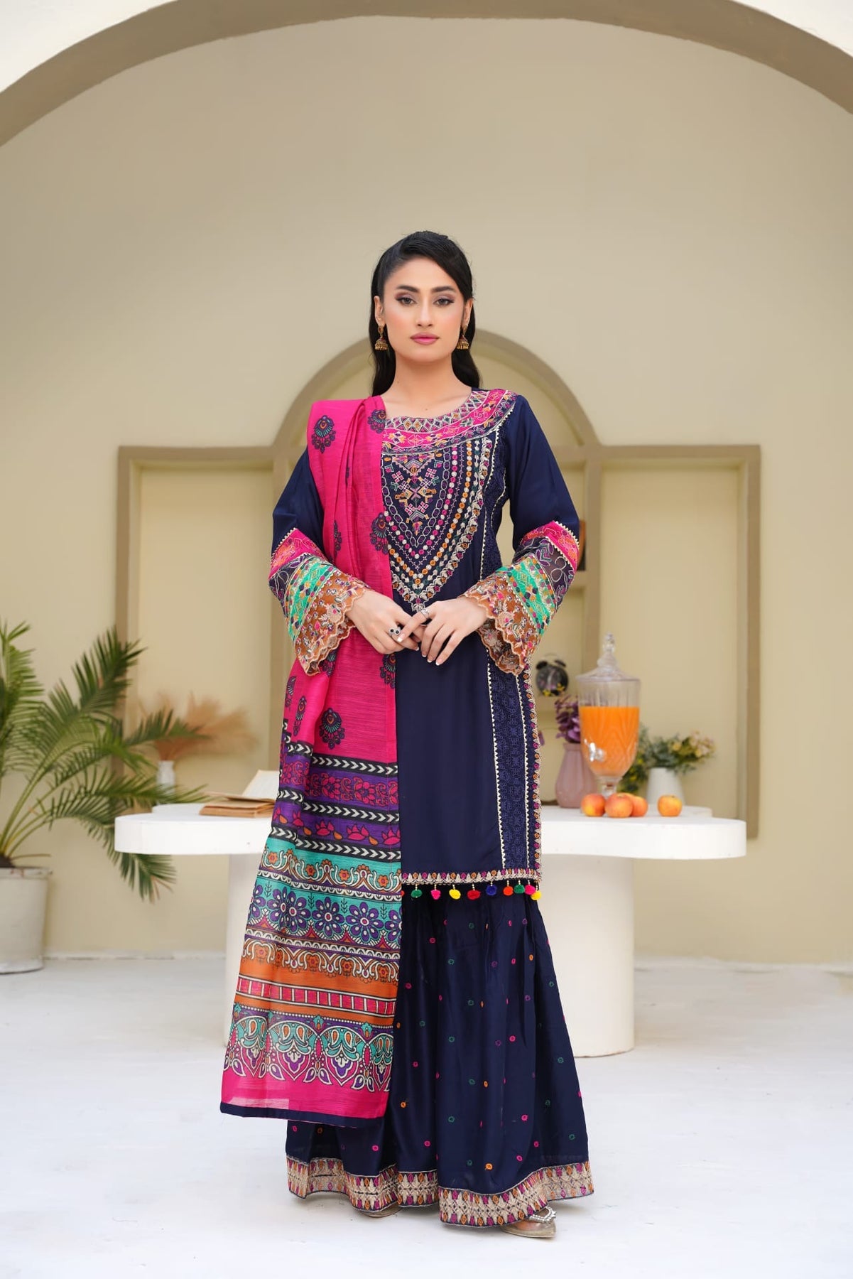 STUNNING EMBROIDERED LINEN COTTON SHIRT, EMBROIDERED GHARARA BOTTOMS & BEAUTIFUL DUPATTA.