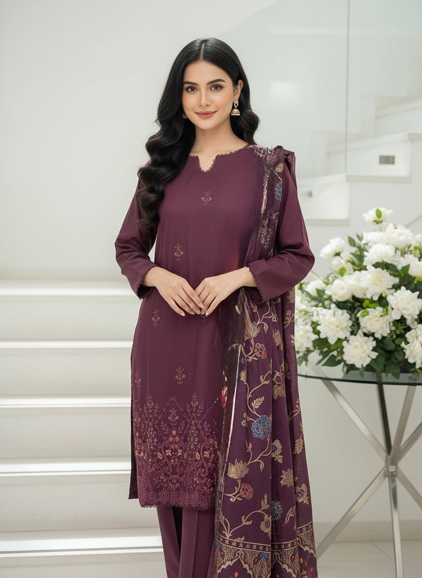 • PREMIUM QUALITY WINTER DHANAK LINEN FABRIC EMBROIDERED 3 PIECES SUIT…HIGH STANDARD BOUTIQUE STITCHING WITH LACE FINISHING
