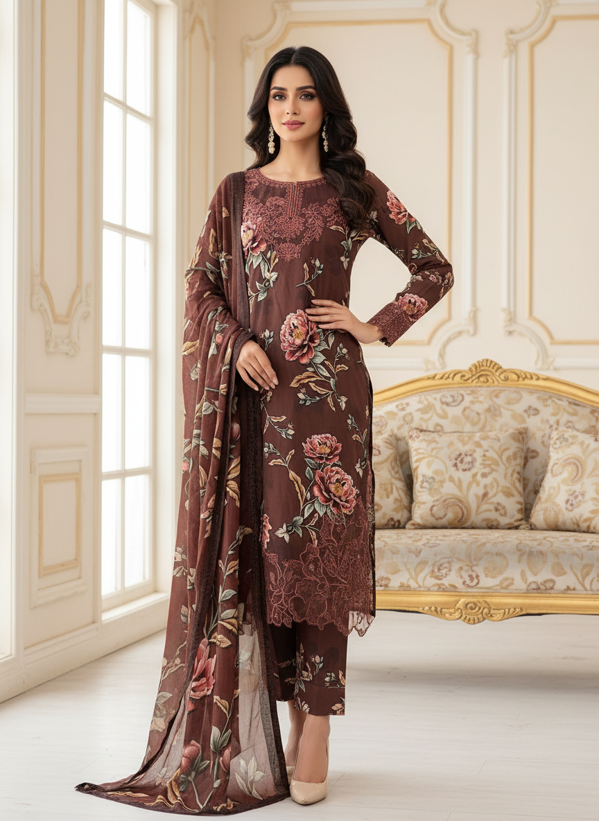 • PREMIUM QUALITY WINTER LINEN FABRIC EMBROIDERED & PRINT 3 PIECES SUIT…HIGH STANDARD BOUTIQUE STITCHING WITH LACE FINISHING