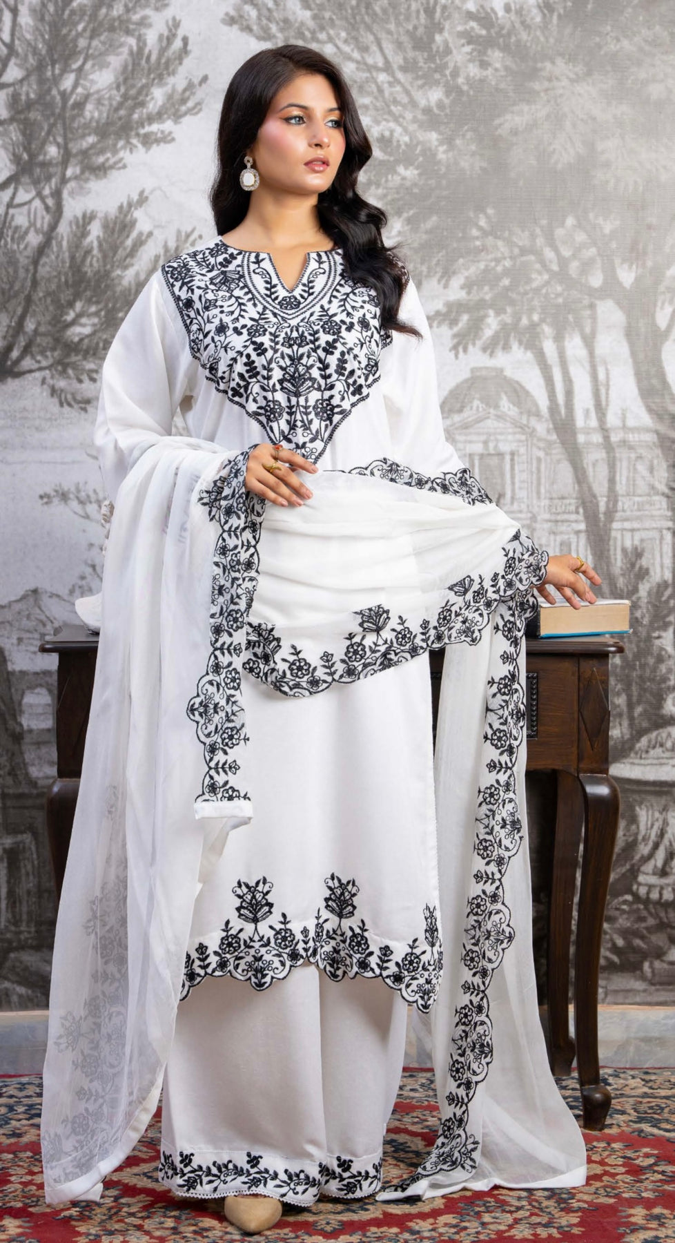 Juliet offering you a fine texture and smooth finish. Elegantly designed panelled straight shirt with intricate embroidery at the front and side panels, further enhanced with embroidered chiffon dupatta.