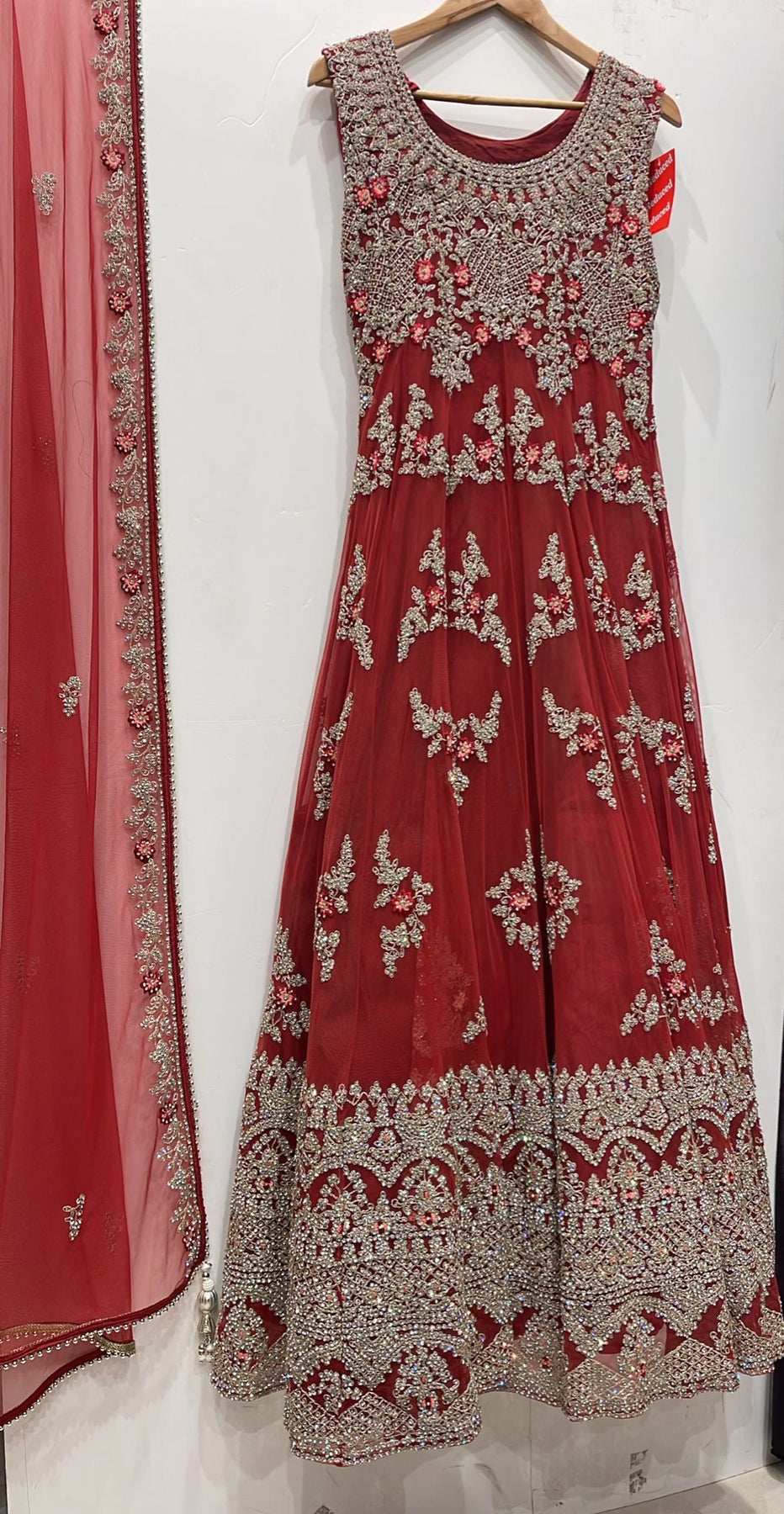7015E- Red Embroidered & Embellished net long dress