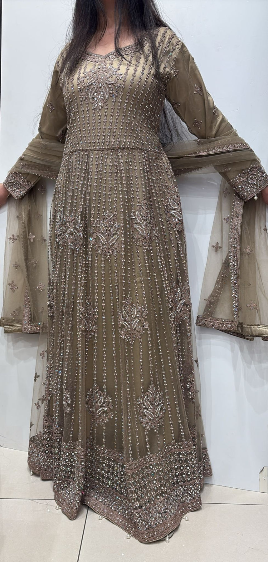 Thread Embroidered & hand Embellished with stones, sequins and pearls net dress  ...