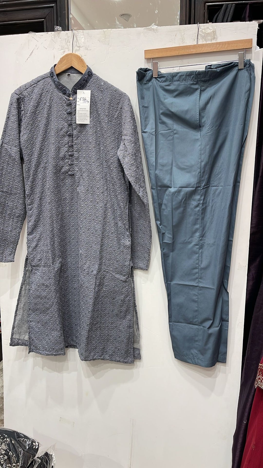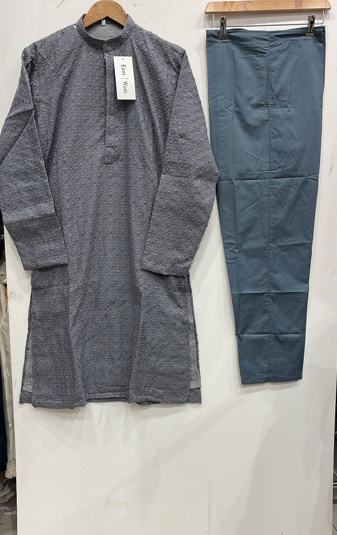 CK771B - Men’s Grey Cotton Hand Embroidered Chikankari Set