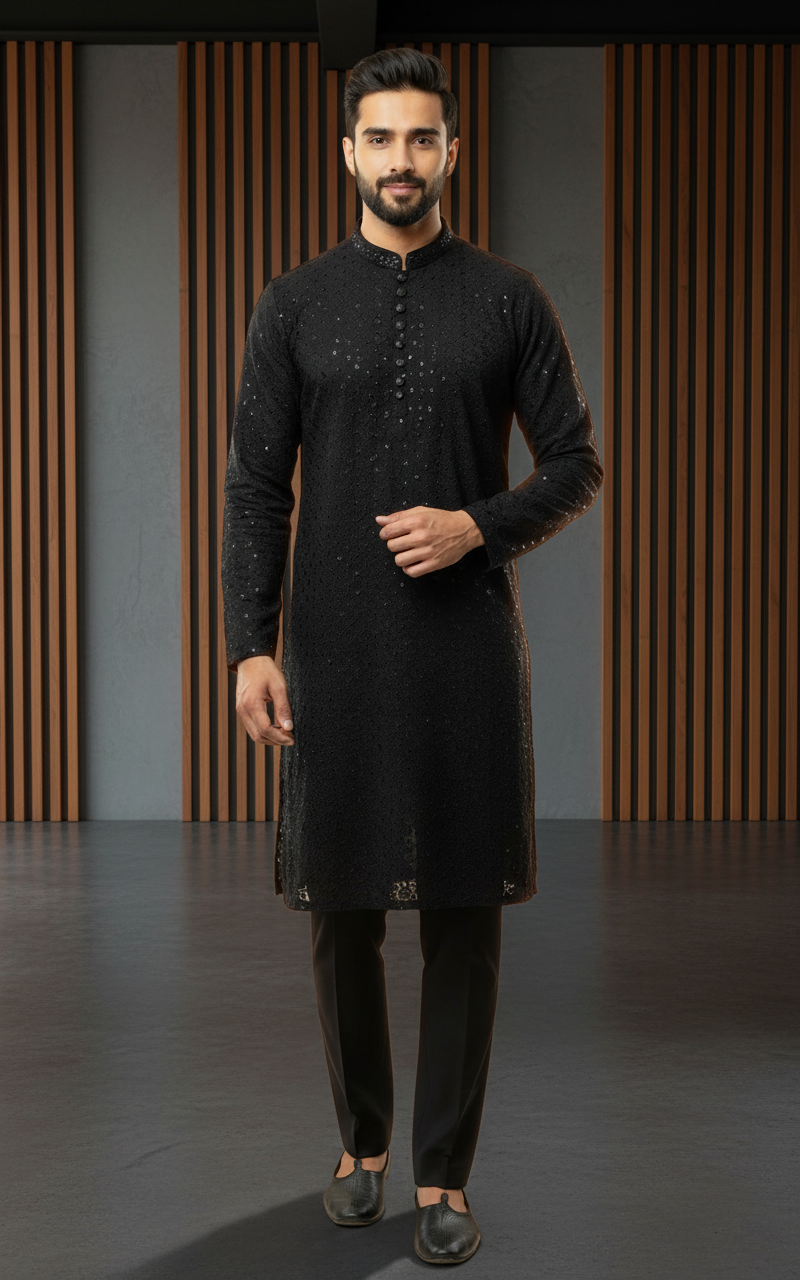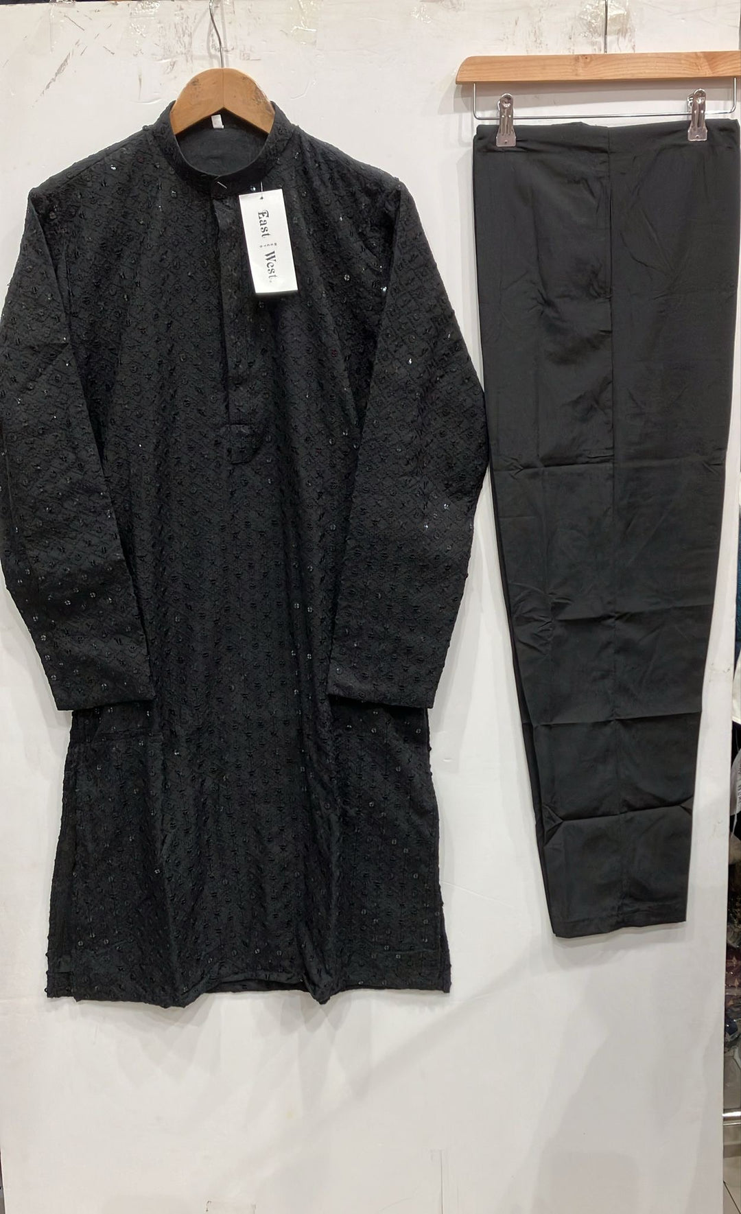 CK761B - Men’s Black Cotton Hand Embroidered Chikankari Set