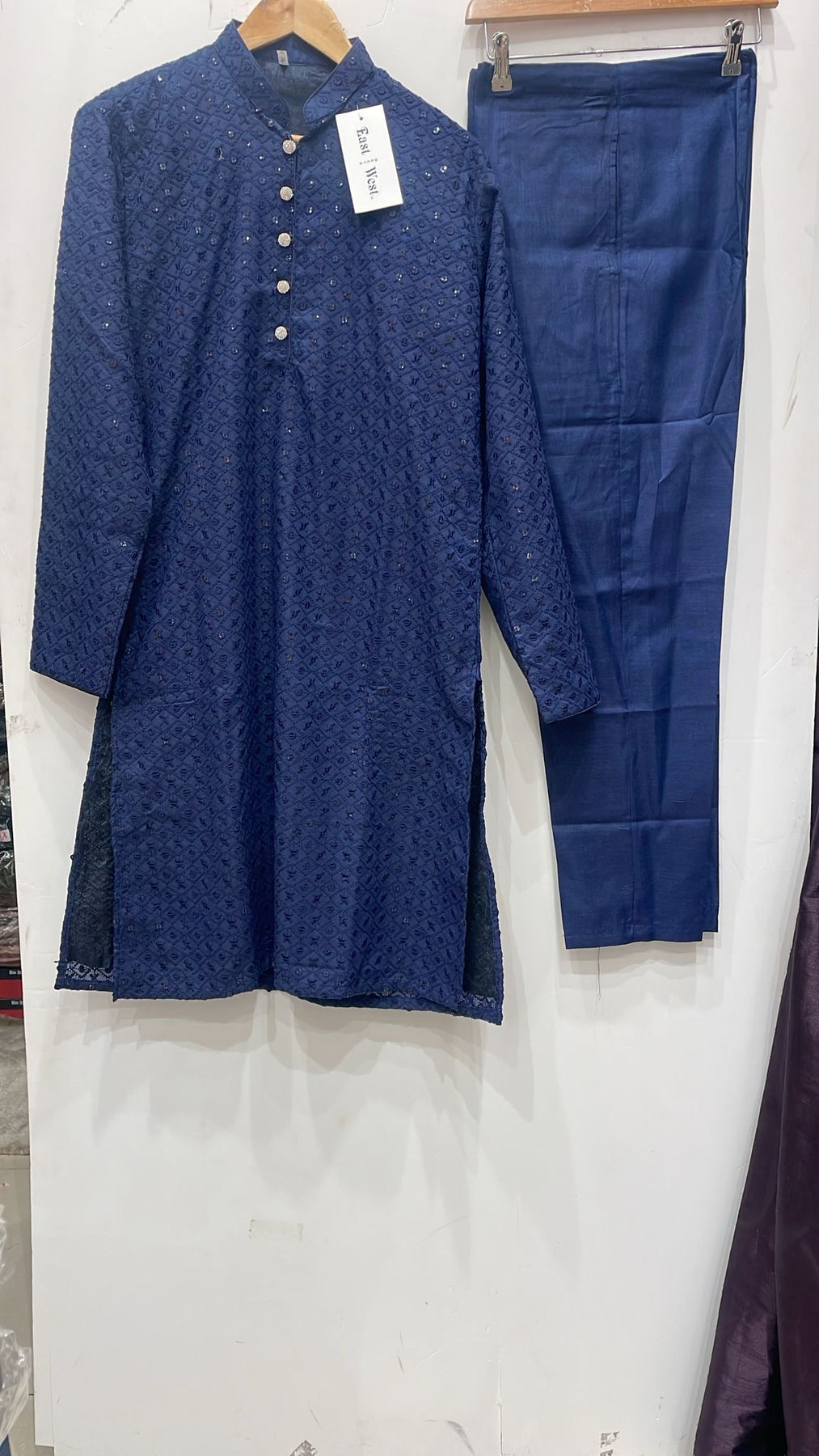 This kurta trousers set features chikankari sequins embroidery with gold rhinestones embellished buttons on the placket. It's a perfect blend of tradition and style. The cotton blended fabric ensures comfort and durability. Ideal for boys and men, it offers a timeless look.