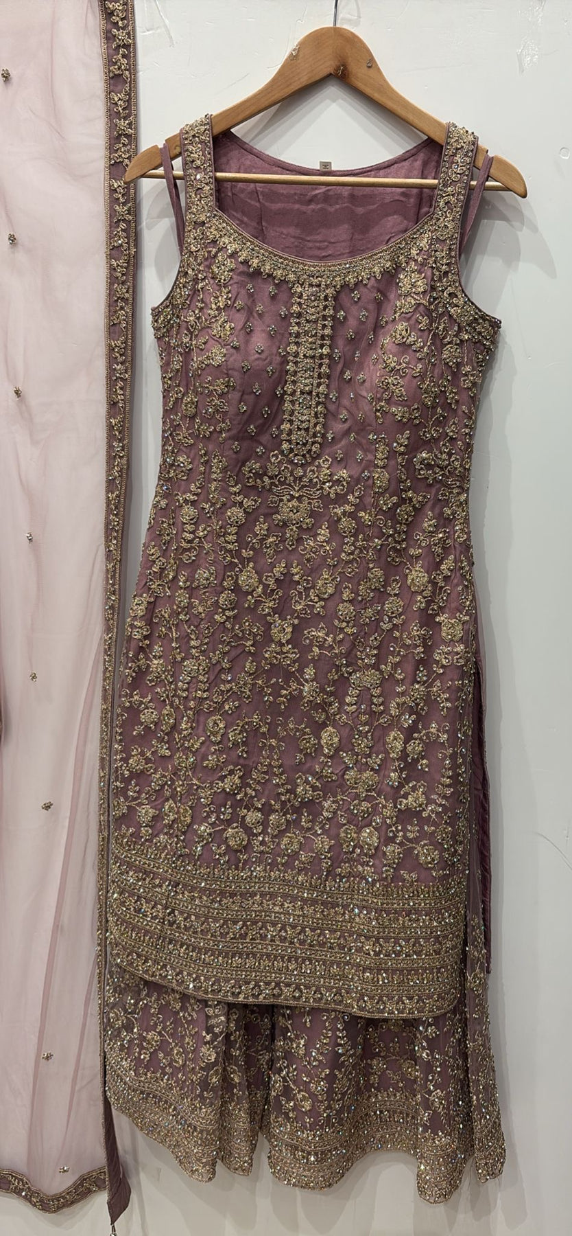 Embroidered net shirt features marvellous embellishments with Stones, pearls, marori, Resham and Paired with Embroidered Sharara trousers and Embroidered net duppatta.