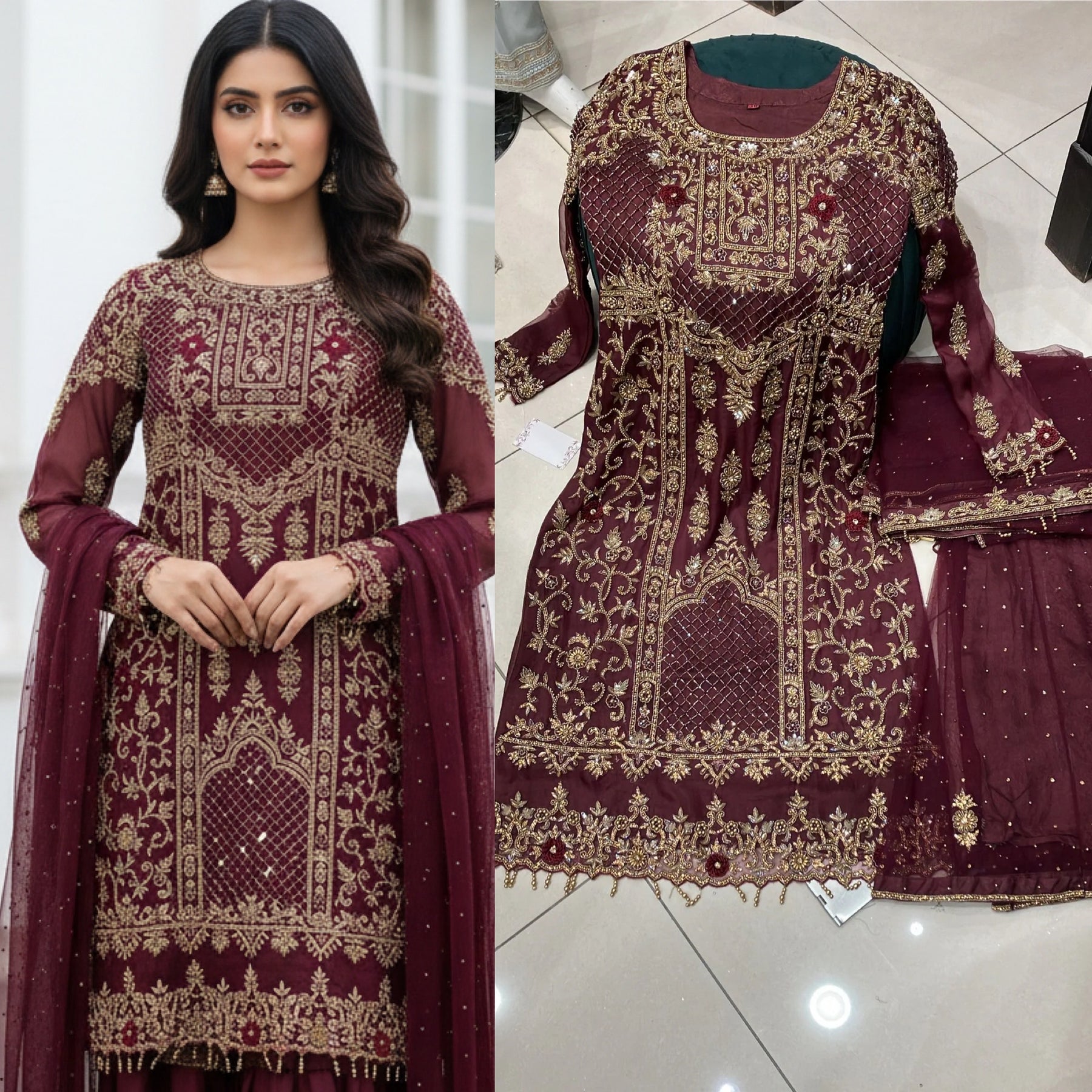 Heavy Embroidered net Organza shirt features marvellous embellishments with pearls, stones, marori , Resham and hand work Paired with Embroidered palazzo trousers and Embroidered net duppatta.