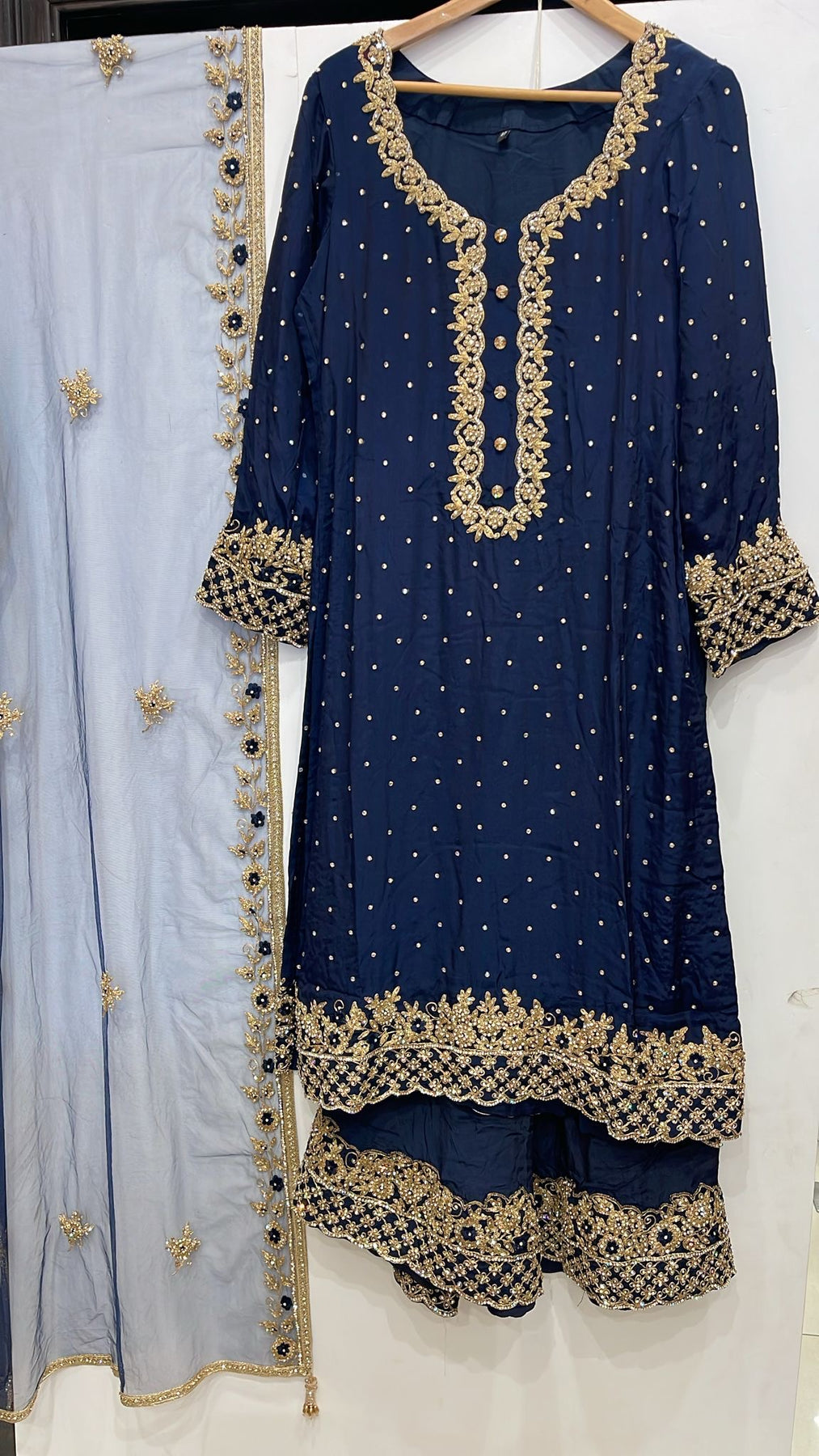 Embroidered georgette shirt features marvellous embellishments with Stones, pearls, marori , Resham and hand work Paired with heavy Embroidered georgette Farshi palazzo trousers and Embroidered net duppatta.