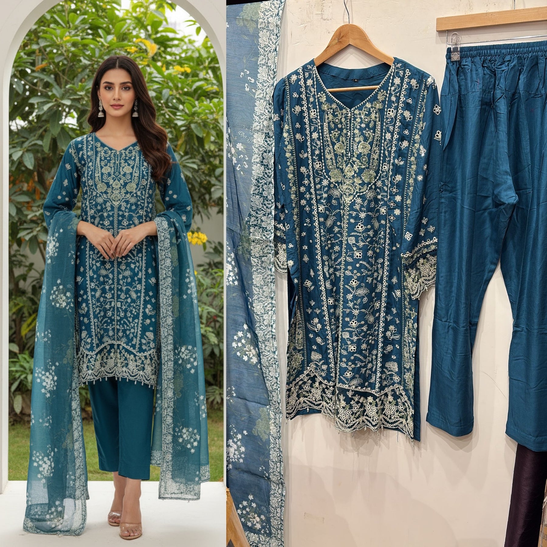 FULLY STITCHED, READY TO WEAR EMBROIDERED LINEN 3 PIECE SUIT STUNNING FANCY EMBROIDERED DUPPATTA & BEAUTIFUL TROUSERS.