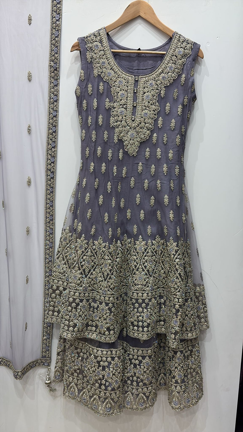 Embroidered net shirt features marvellous embellishments with Stones, pearls, marori, Resham and Paired with Embroidered Sharara trousers and Embroidered net duppatta.